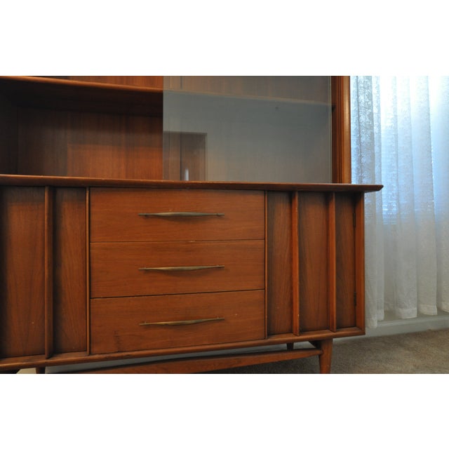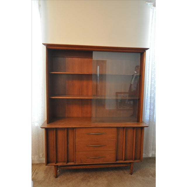 Refurbished vintage mid century modern credenza / buffet / media console!!! The bottom doors open to reveal four drawers, three shelves, and a silverware / flatware drawer. Perfect for entertaining or just staying organized, our credenzas offer plenty of storage and service space paired with great style. Broyhill sculptra walnut slate mid century modern buffet sideboard credenza mcm. Amazing credenza with removable hutch.